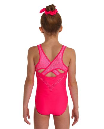 Striking self coloured neon pink sports lycra training leotard, featuring AB crystal design and new secure NGR open back