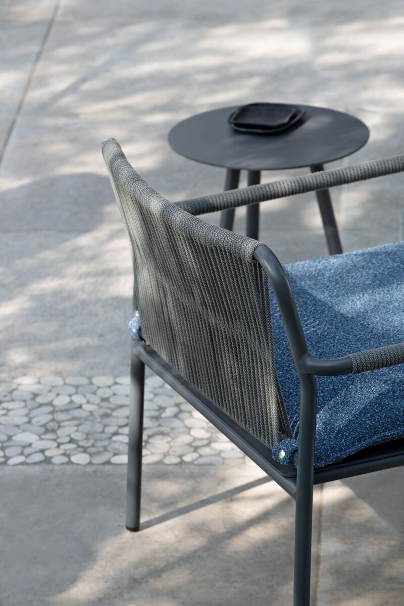 A low lounge chair with armrests and powder-coated frame.