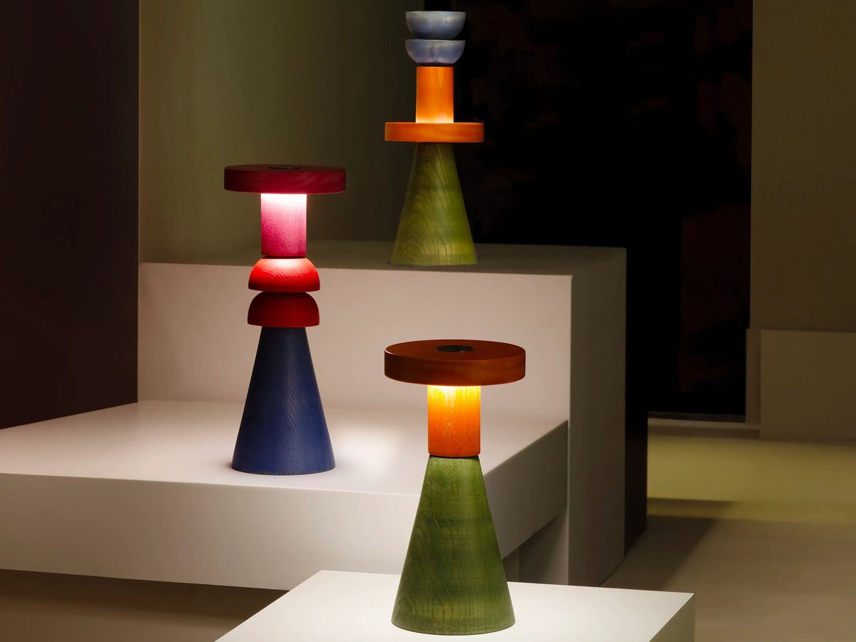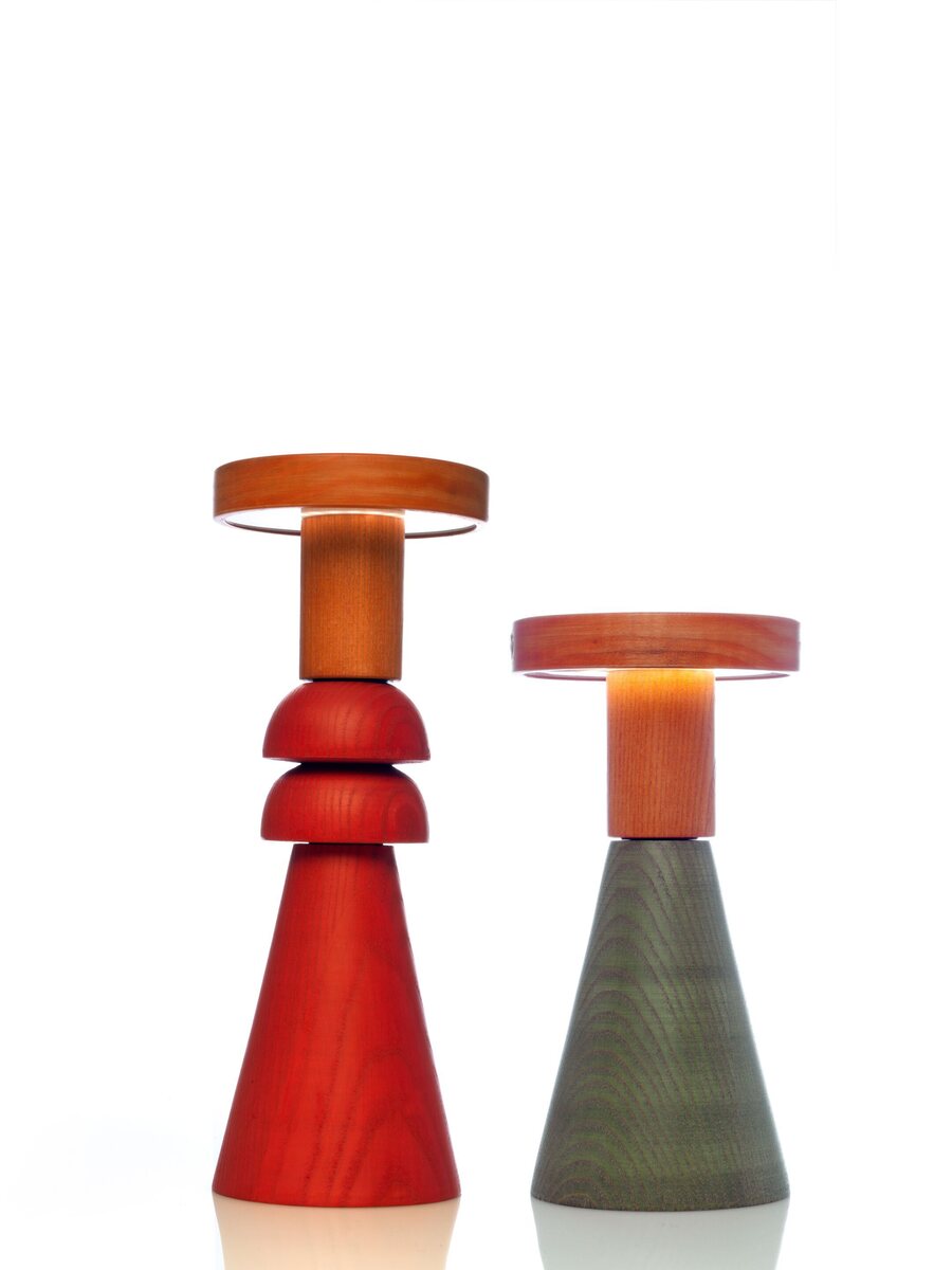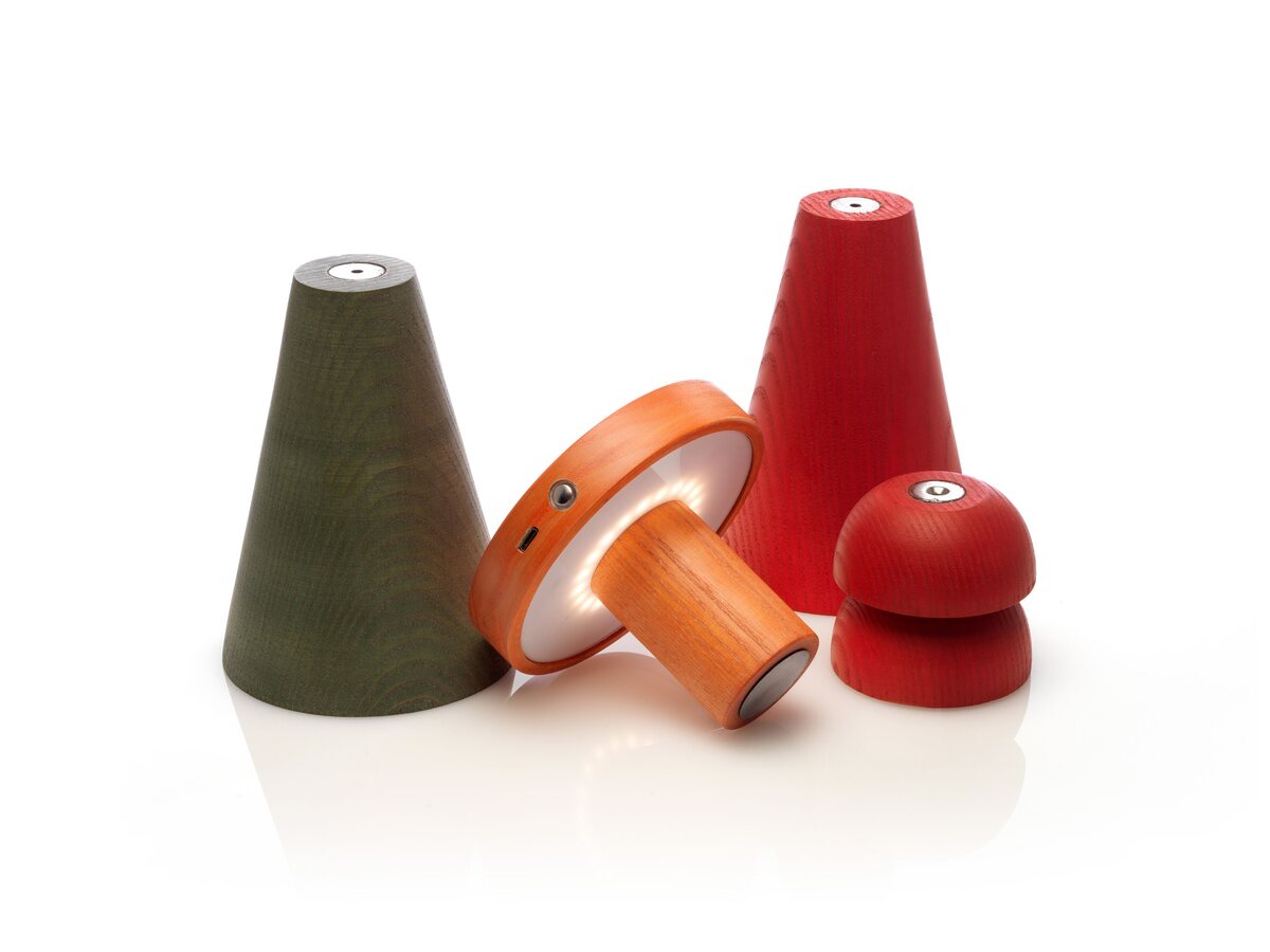 The Scacco Matto Lamp by Lumere is a portable, modular table lamp crafted from aluminum and wood. Its magnetic components allow for five different configurations, offering versatility in lighting and design.