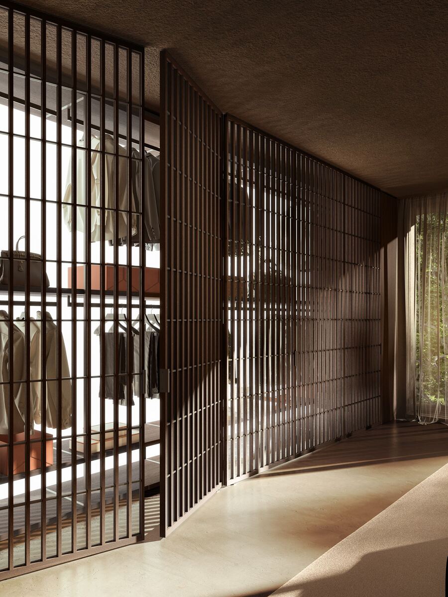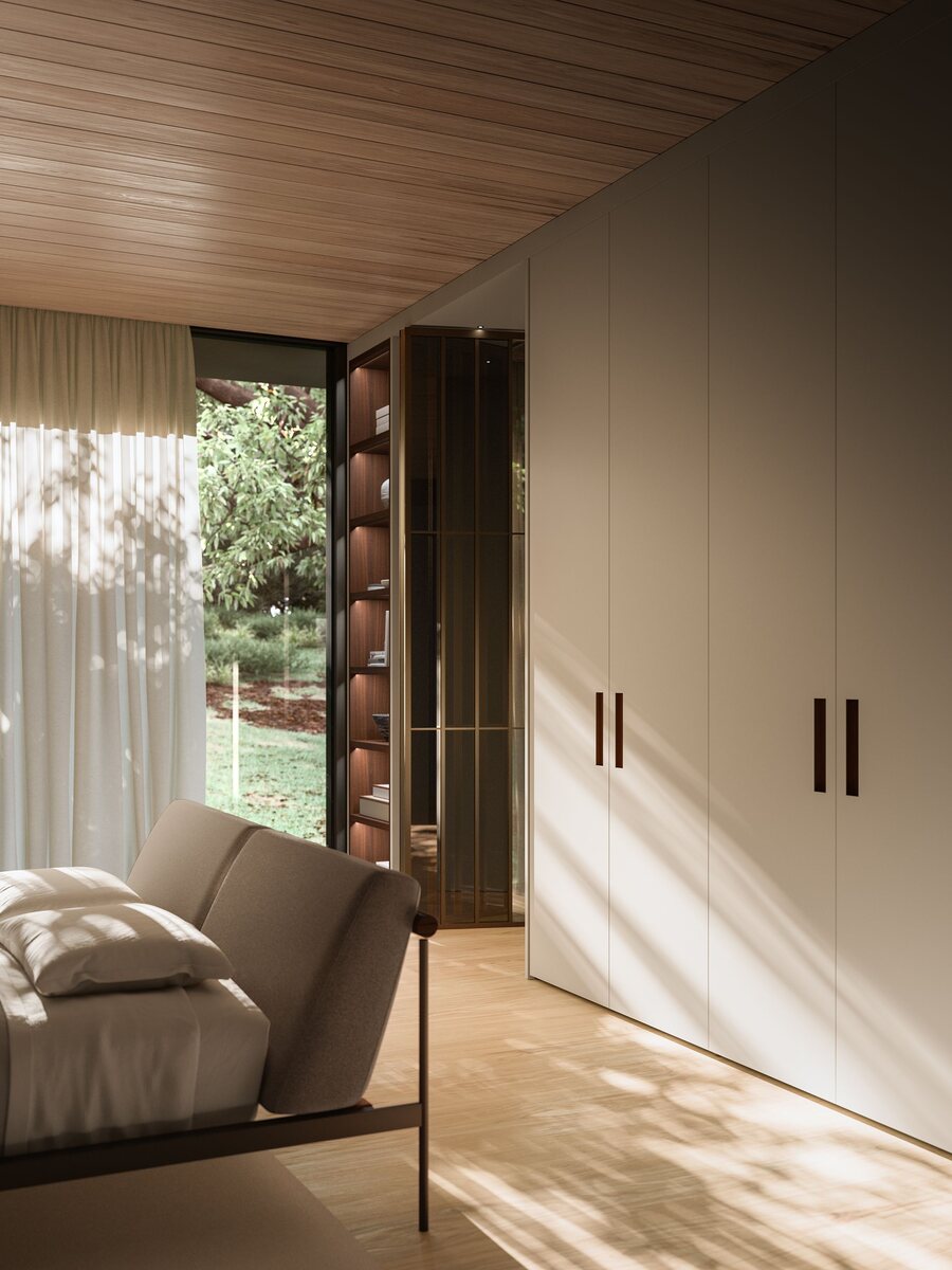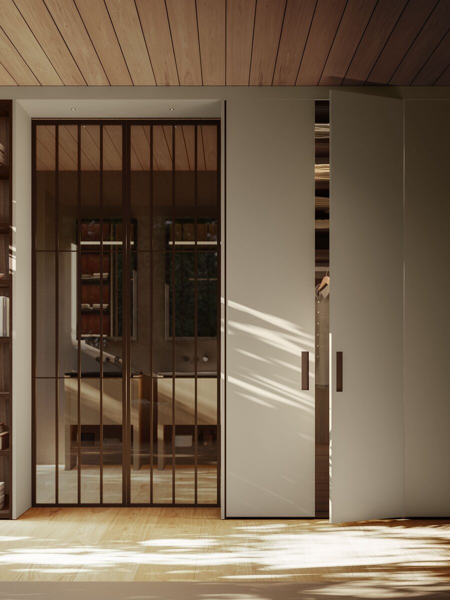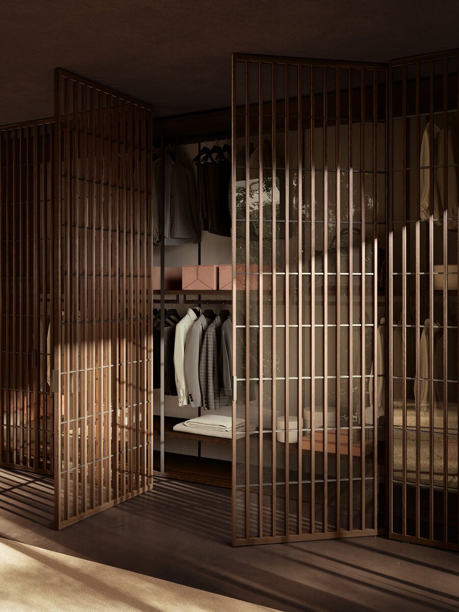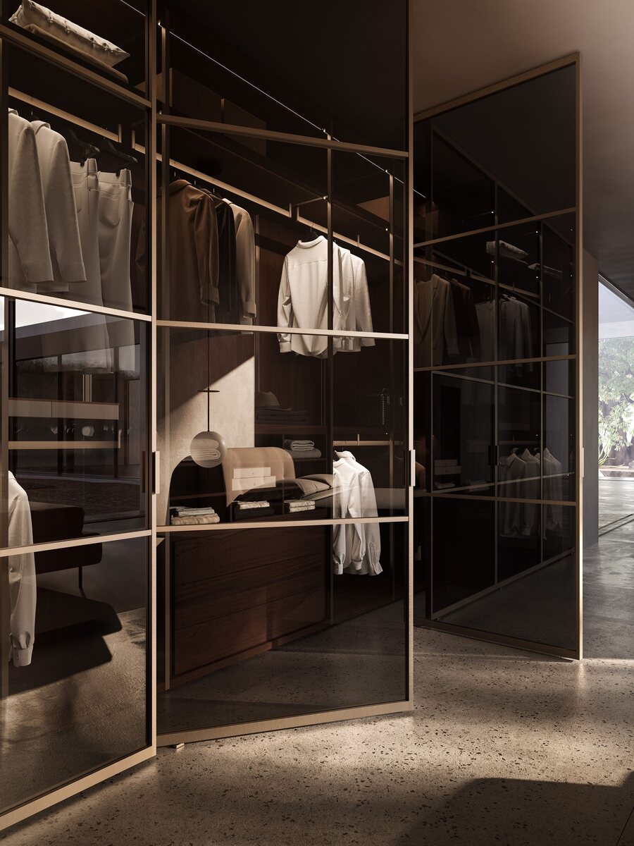 The Antibes Wardrobe by Boffi features a modular design with aluminum frame, glass or melamine panels, and internal drawers. It’s ideal for fully personalized storage.