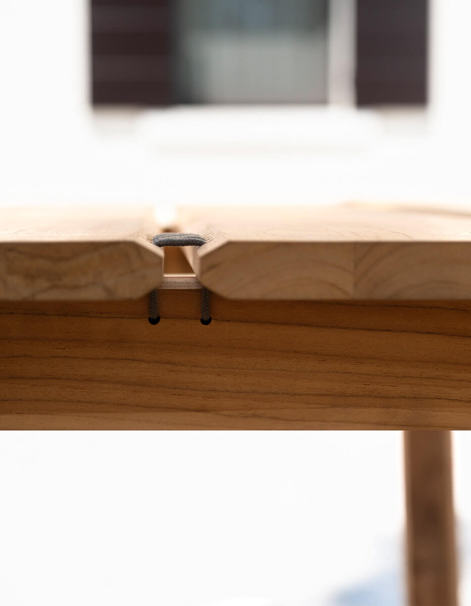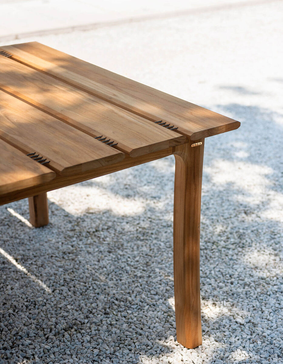 The Teak Garden Table by RODA is crafted from solid teak with clean lines and a robust silhouette. Ideal for outdoor gatherings.