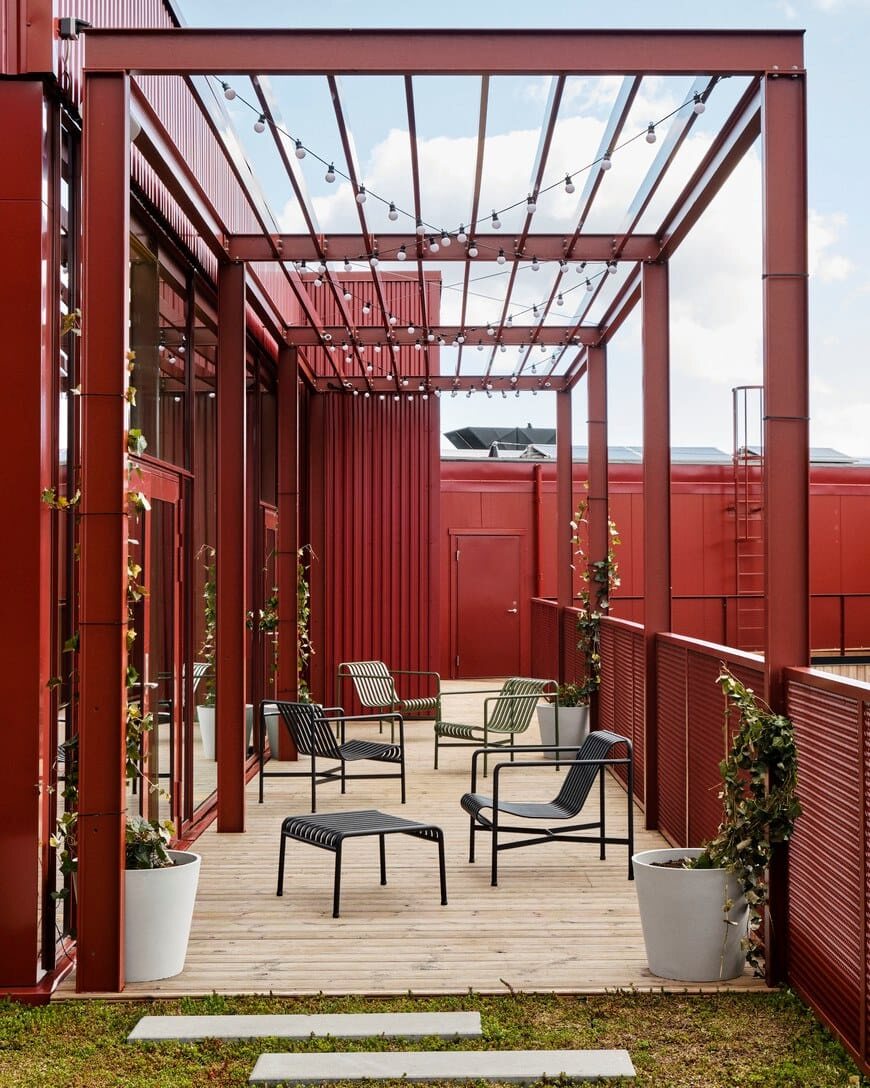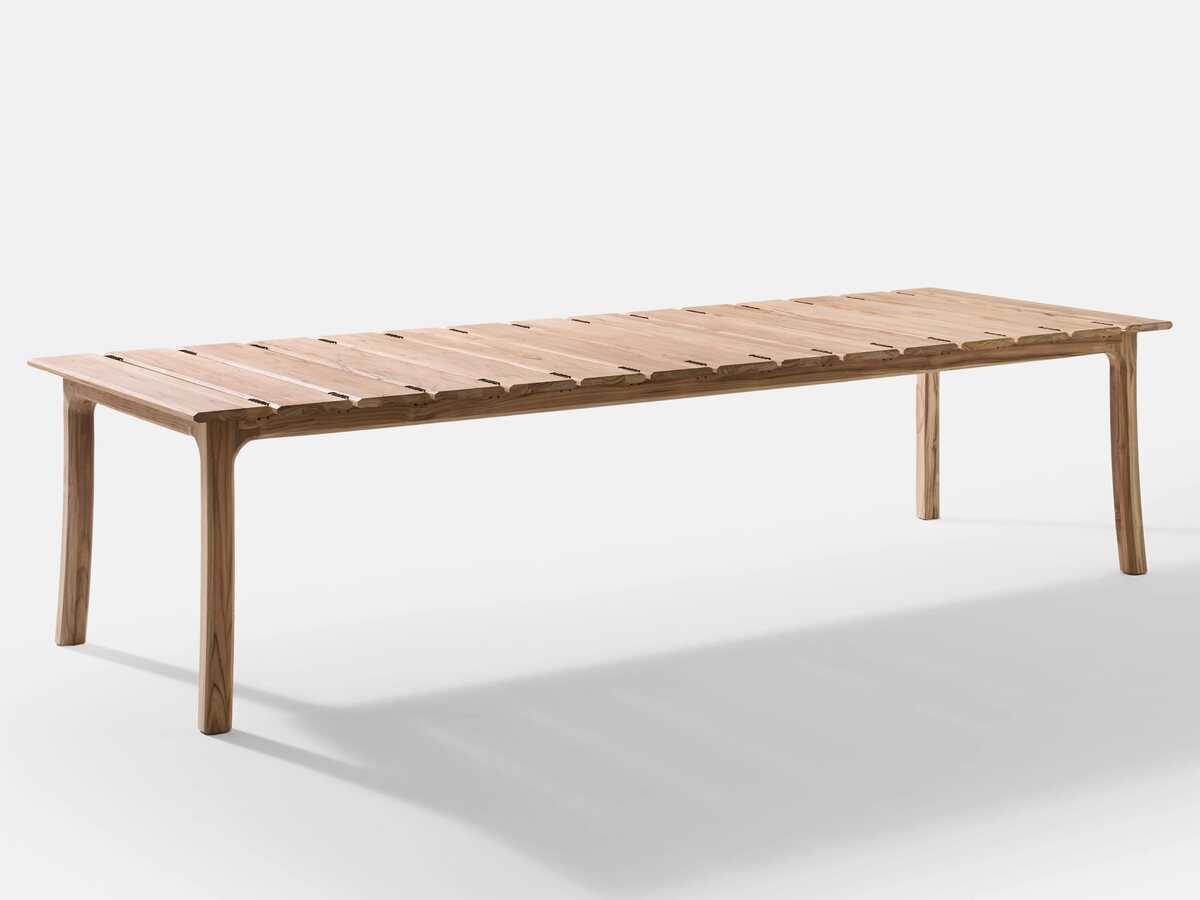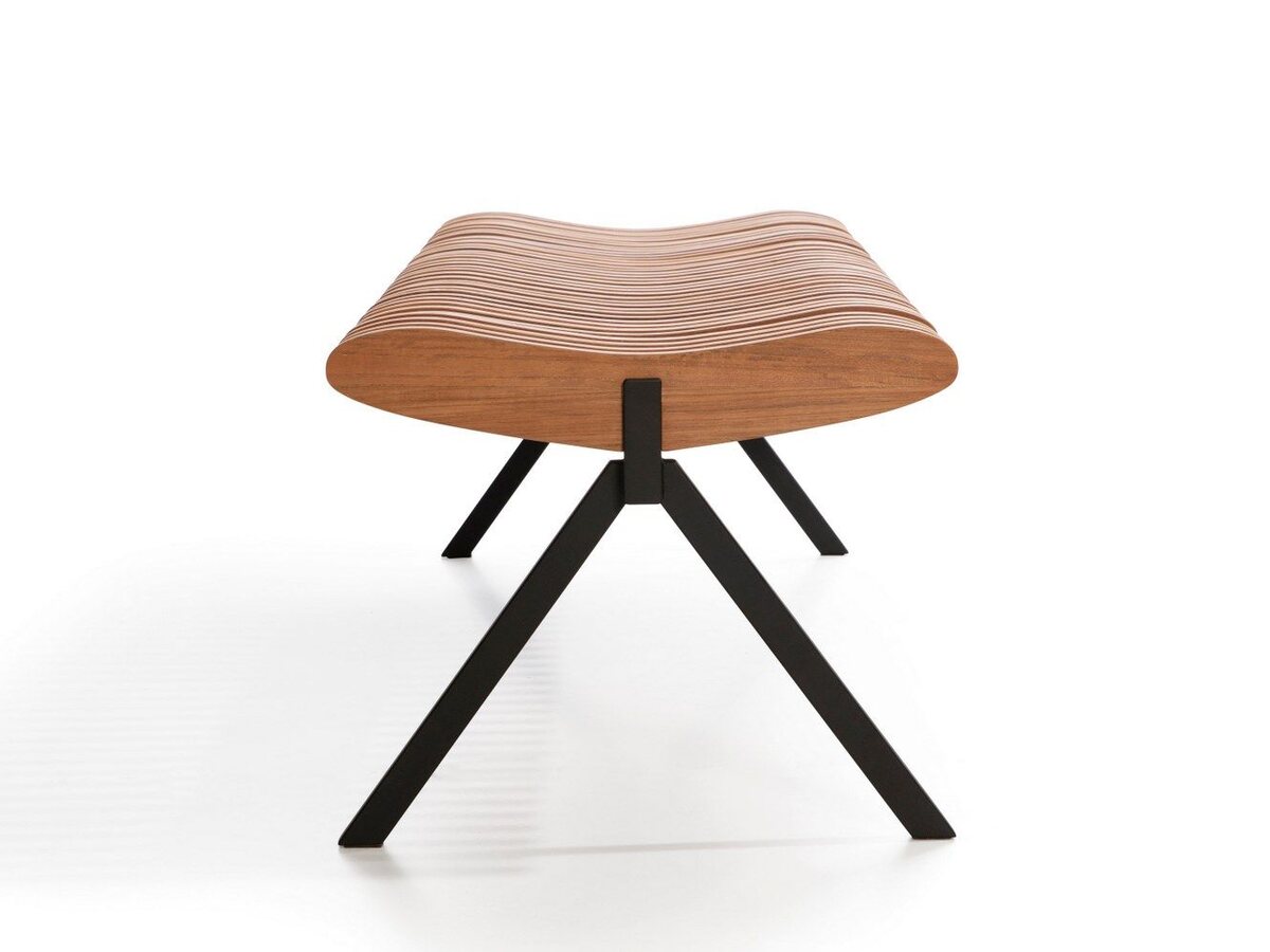 Designed by Caroline Voet for PER/USE, the Teak Slatted Garden Bench combines a stainless-steel base with flowing and elegant wooden parts, creating an unexpected visual effect. Despite its striking appearance, it maintains comfortable and ergonomic qualities. This bench serves as an inspiring design object suitable for homes, business locations, or public spaces.